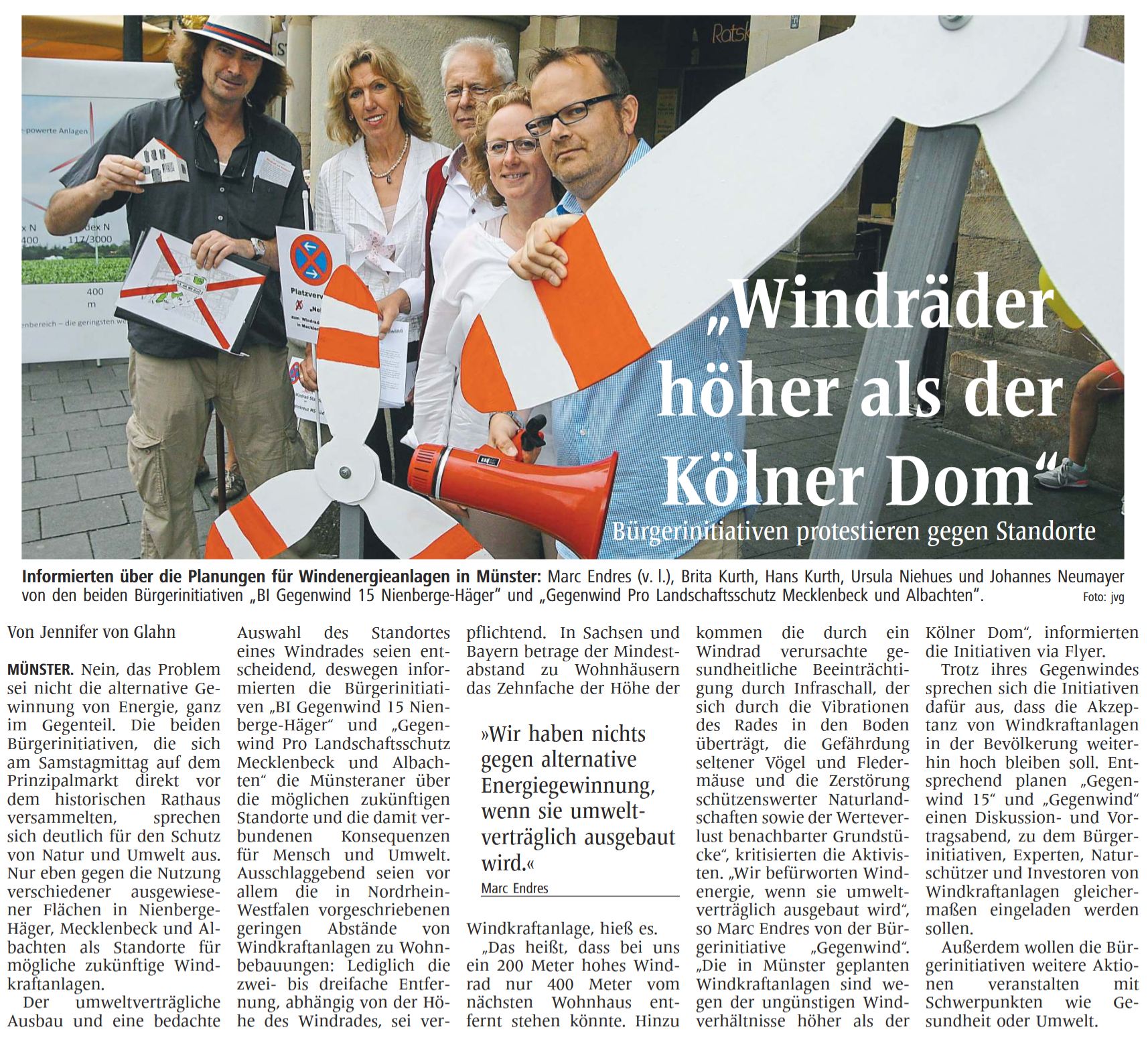 Hinzukommen die durch ein Windrad verursachte gesundheitliche Beeinträchtigung durch Infraschall, der sich durch die Vibrationen des Rades in den Boden überträgt, die Gefährdung seltener Vögel und Fledermäuse und die Zerstörung schützenswerter Naturlandschaften sowie der Werteverlust benachbarter Grundstücke“, kritisierten die Aktivisten. „Wir befürworten Windenergie, wenn sie umweltverträglich ausgebaut wird“, so Marc Endres von der Bürgerinitiative „Gegenwind“. „Die in Münster geplanten Windkraftanlagen sind wegen der ungünstigen Windverhältnisse höher als der Kölner Dom“, informierten die Initiativen via Flyer. Trotz ihres Gegenwindes sprechen sich die Initiativen dafür aus, dass die Akzeptanz von Windkraftanlagen in der Bevölkerung weiterhin hoch bleiben soll. Entsprechend planen „Gegen-wind 15“ und „Gegenwind“ einen Diskussion- und Vortragsabend, zu dem Bürgerinitiativen, Experten, Naturschützer und Investoren von Windkraftanlagen gleichermaßen eingeladen werden sollen. Außerdem wollen die Bürgerinitiativen weitere Aktionen veranstalten mit Schwerpunkten wie Gesundheit oder Umwelt.